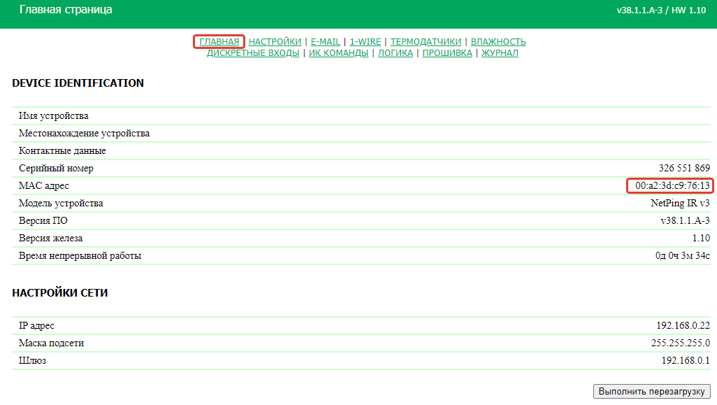 MAC-адрес устройства можно посмотреть на главной странице веб-интерфейса устройства: