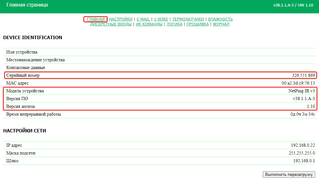 Информацию о версии встроенного ПО, версии железа и серийный номер устройства можно посмотреть на главной странице веб-интерфейса устройства: