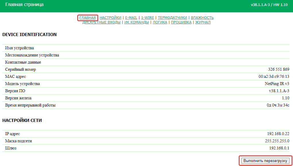 Устройство ИК контроллер с ETH, модель 3801 можно перезагрузить двумя способами: