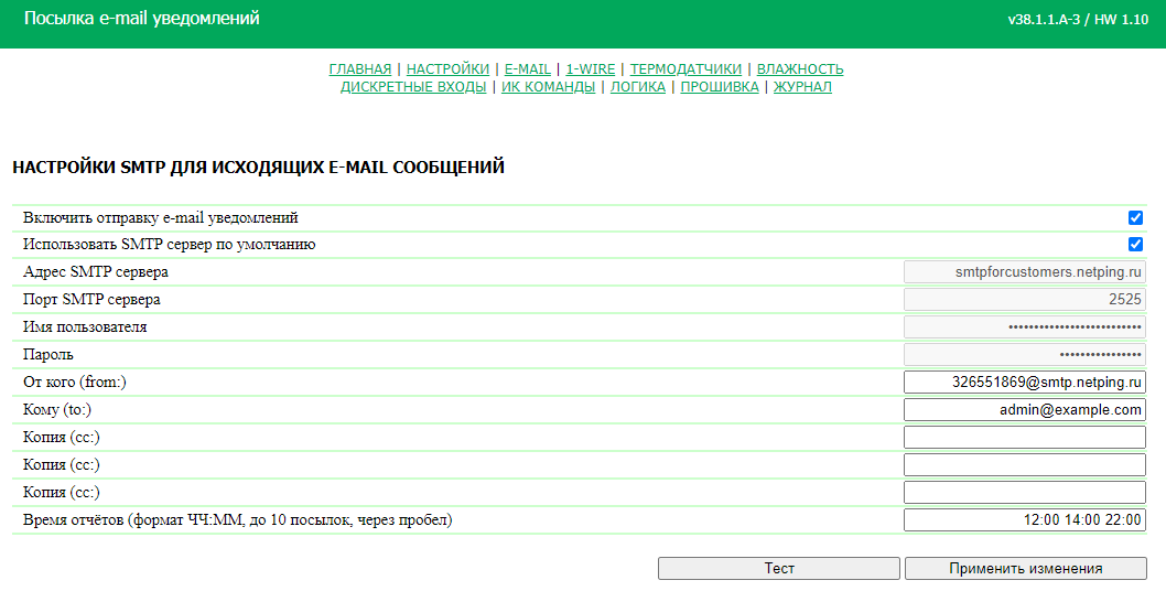 Устройство может работать только с теми почтовыми серверами, которые поддерживают SMTP-протокол и методы аутентификации AUTH PLAIN и AUTH LOGIN, а также метод без аутентификации! При этом устройство не может поддерживать SSL, TLS или другое шифрование!