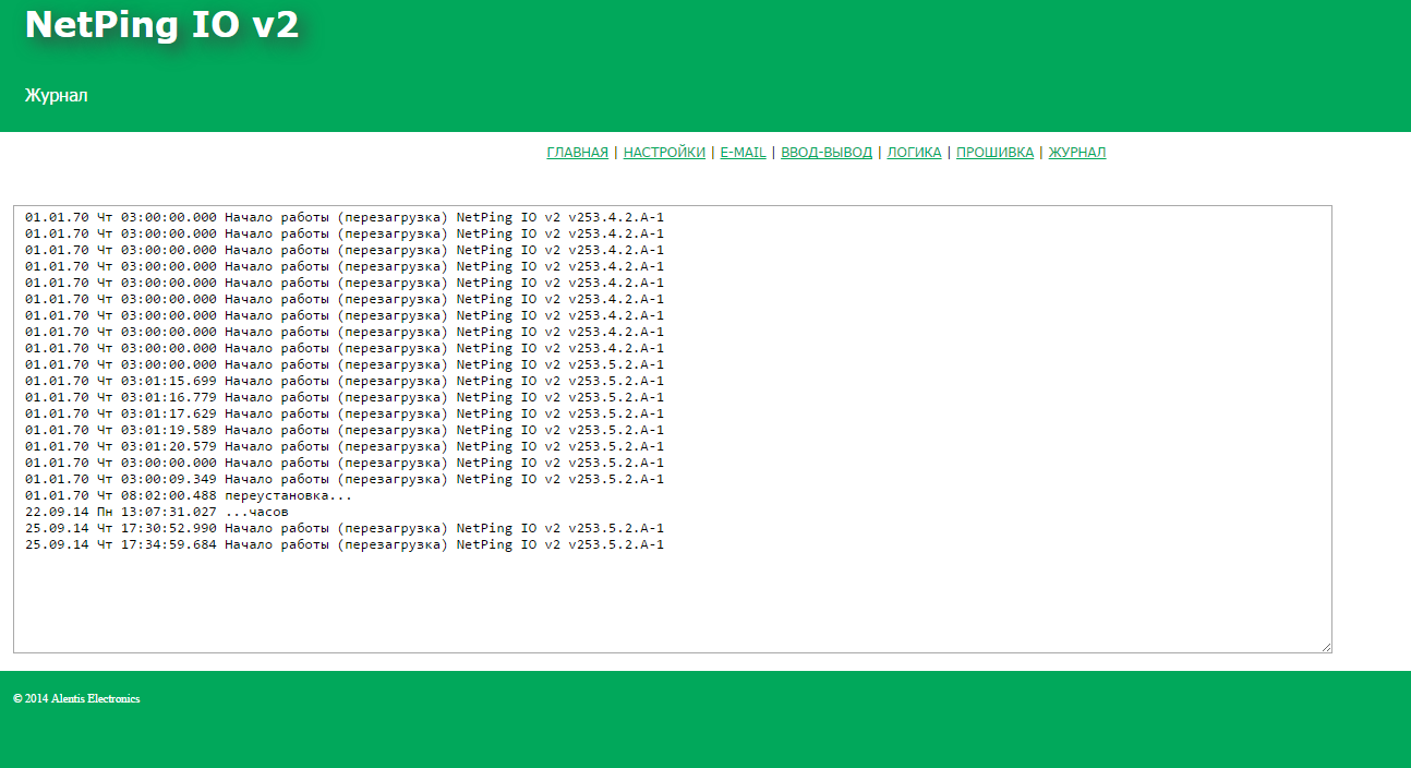 ION=Y XXXX ZZZZ — записывается в журнал, когда на IO-линии меняется текущий логический уровень (переход из состояния «0» в состояние «1» и наоборот) при включенных уведомлениях в журнале от IO-линии. N — номер IO-линии. Y — текущий логический уровень IO-линии. XXXX — описание IO-линии, заданное пользователем на странице «ВВОД-ВЫВОД» веб-интерфейса устройства, ZZZZ — расшифровка логического уровня IO-линии, заданная пользователем в окне настройки уведомлений для IO-линии.