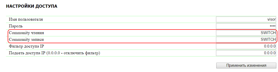 Community чтения – настройка Community для чтения данных из устройства по протоколу SNMP. Максимальный размер – 16 символов. По умолчанию: SWITCH.