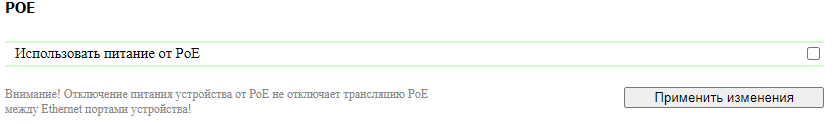 Включение и отключение питания устройства по PoE осуществляется на странице «НАСТРОЙКИ» веб-интерфейса устройства.
