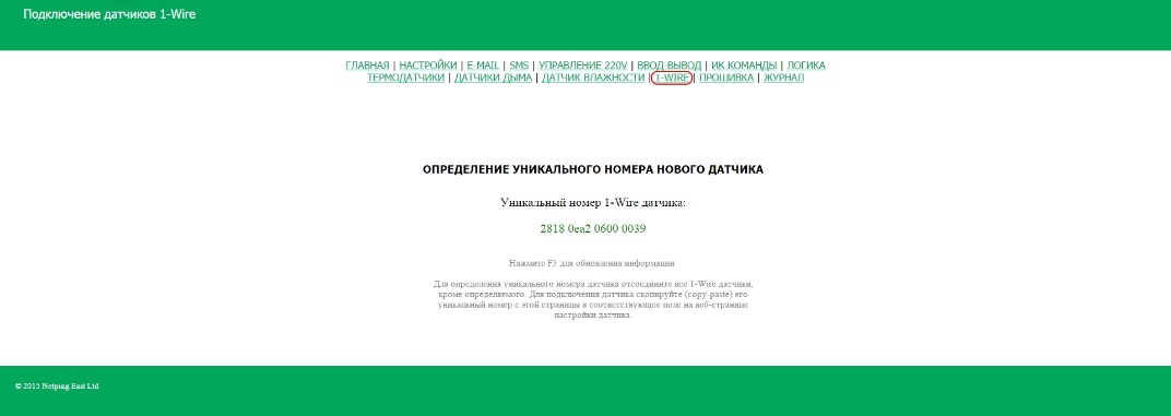 Перейти на страницу «1-WIRE» web-интерфейса. В окне браузера будет показан уникальный номер датчика 1-Wire