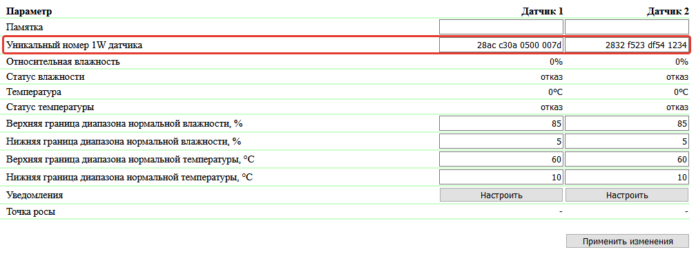 Уникальный номер 1W датчика имеет вид 2818 0ea2 0600 0039 (состоит из четырех групп шестнадцатеричных цифр 0...9 a...f.). По умолчанию: пустая строка.
