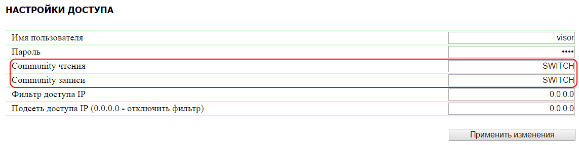 Community чтения — секретное слово, которое необходимо указывать в любом запросе на чтение параметров по протоколу SNMP. Указывается в разделе «Настройки доступа» на странице «НАСТРОЙКИ» веб-интерфейса устройства.