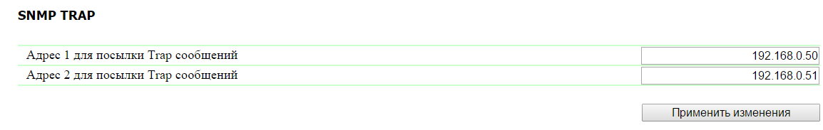 Адрес 1 для посылки Trap-сообщений — IP-адрес, на который будут отправляться TRAP-сообщения. Указывается на странице «НАСТРОЙКИ» веб-интерфейса устройства.