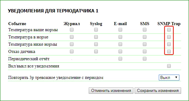 Температура выше нормы — отправка SNMP TRAP-сообщений при превышении верхней границы нормы, указанной для датчика.
