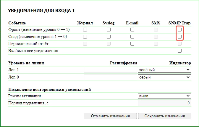 Фронт (изменение уровня 0->1) — чекбокс, разрешающий отправку SNMP TRAP-сообщений при изменении логического уровня на Input линии с низкого на высокий (фронт сигнала). Настраивается кнопкой «Настроить» на странице «ДИСКРЕТНЫЕ ВХОДЫ» веб-интерфейса устройства.