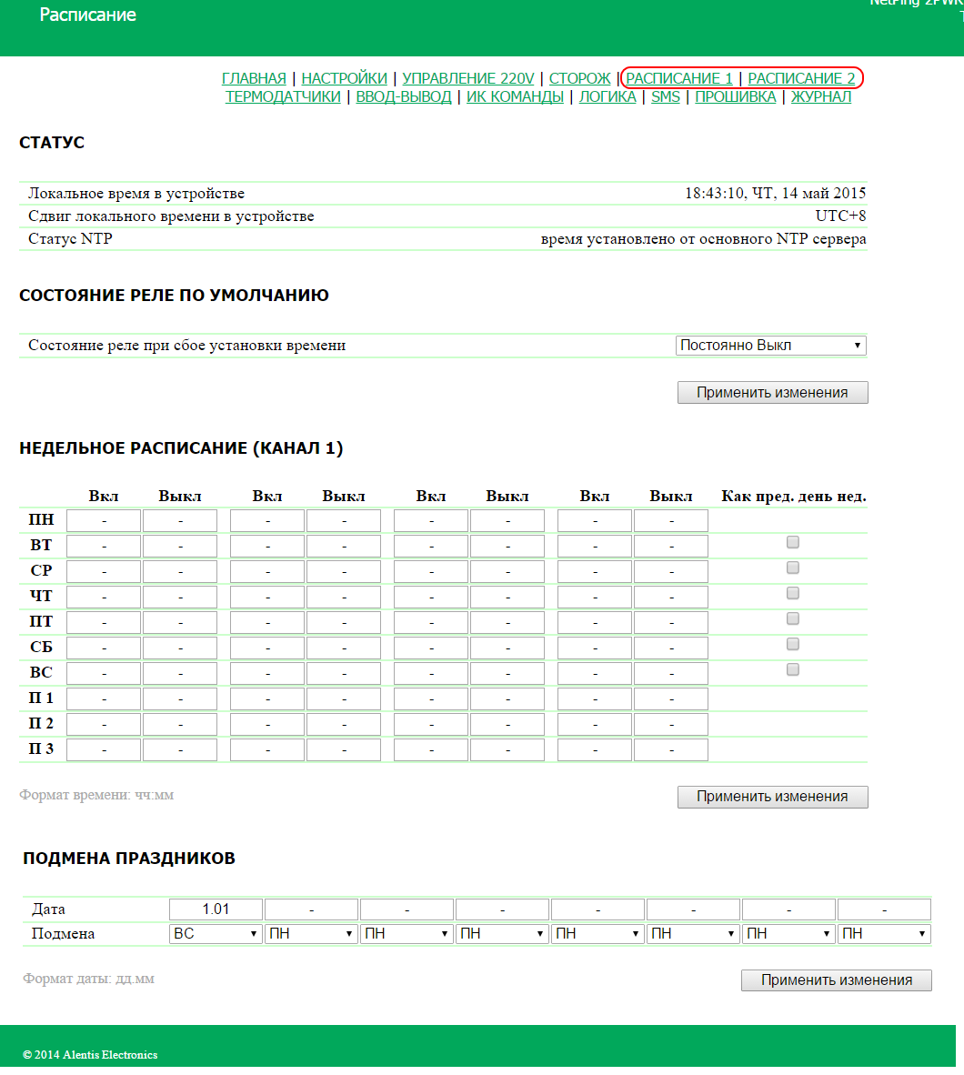 Для использования модуля «Расписание» реле необходимо перевести в режим «Расписание» либо «Расп+Сторож» на странице «УПРАВЛЕНИЕ 220V» web-интерфейса устройства. Для настройки модуля «Расписание» необходимо зайти на страницу «РАСПИСАНИЕ 1» или «РАСПИСАНИЕ 2» web-интерфейса устройства: