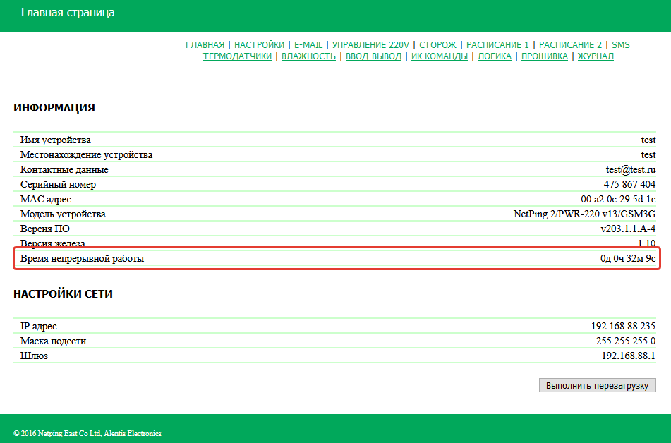 Время непрерывной работы устройства можно посмотреть на главной странице web-интерфейса устройства:
