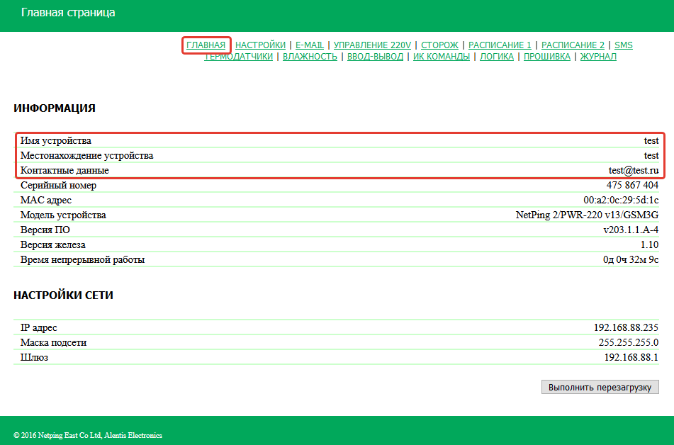 Имя устройства, его местонахождение и контактные данные владельца отображаются на главной странице web-интерфейса устройства.