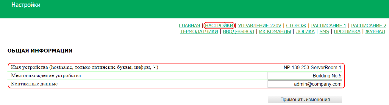 Для настройки имени и местонахождения устройства, а также контактных данных необходимо перейти на страницу «НАСТРОЙКИ» web-интерфейса устройства: