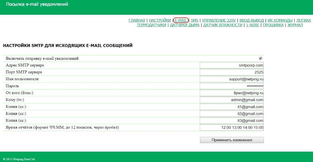 Время отчётов (формат ЧЧ:ММ, до 12 посылок, через пробел) – время, когда будут отправляться отчеты по e-mail о состоянии датчиков. По умолчанию: пустая строка