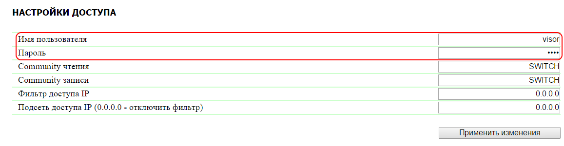 Имя пользователя – поле для установки или изменения имени пользователя при доступе к устройству через web-интерфейс. Используются буквы латинского алфавита, цифры и некоторые спец. символы. Максимальный размер – 16 символов. По умолчанию: visor