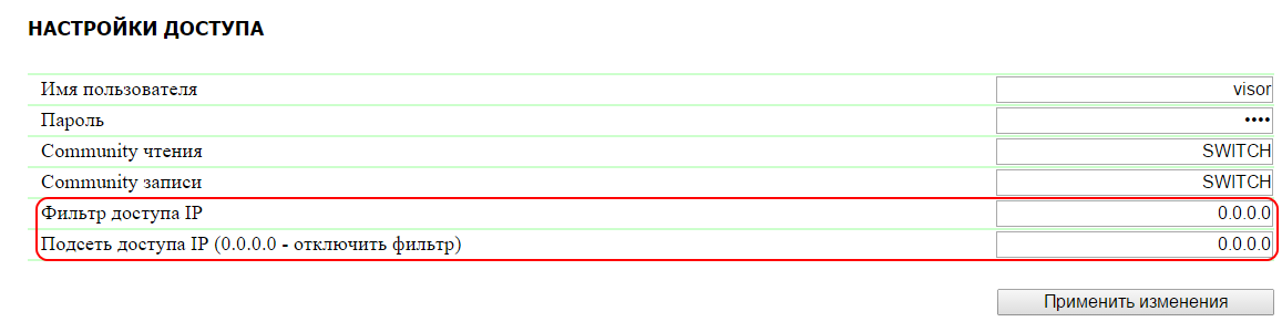 Подсеть доступа IP — поле для установки или изменения маски подсети фильтра доступа к устройству. Значение 0.0.0.0 означает, что фильтр доступа отключен. По умолчанию: 0.0.0.0.