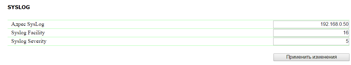 Адрес SysLog — IP-адрес SYSLOG-сервера; журнал устройства будет полностью дублироваться на SYSLOG-сервере;