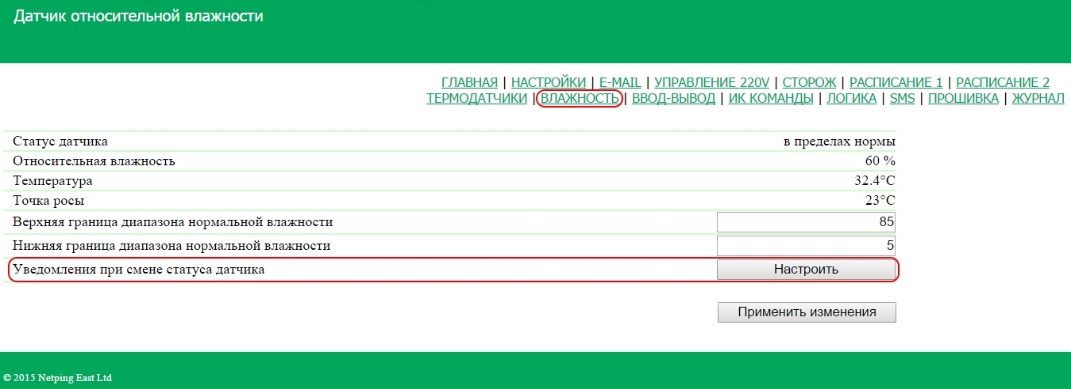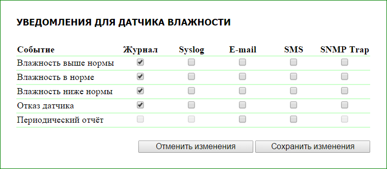Настройка отправки уведомлений при смене статуса датчика влажности производится на странице «ВЛАЖНОСТЬ» web-интерфейса устройства: