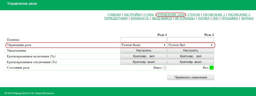 Настройка режима управления встроенным реле производится на странице «УПРАВЛЕНИЕ 220V» web-интерфейса устройства: