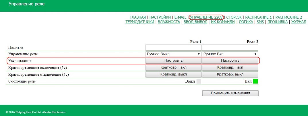 Включение/выключение реле – чек-бокс, при наличии которого будут отправляться уведомления об изменении состояния реле.