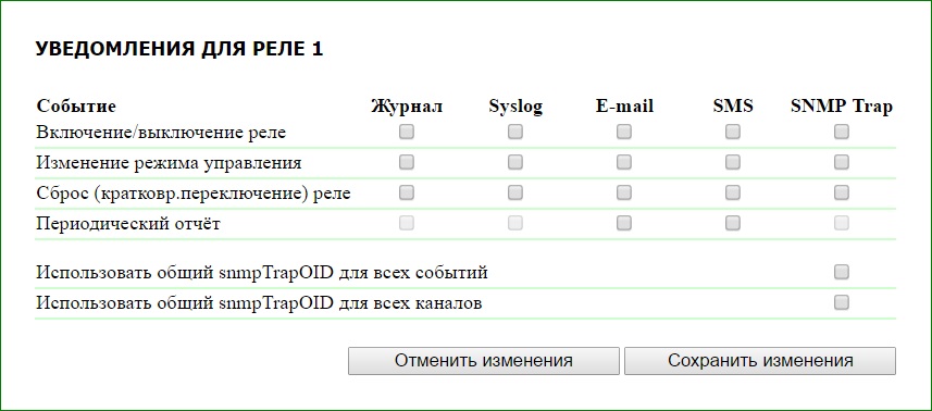 Чек-боксами «Использовать общий snmpTrapOID для всех событий» и «Использовать общий snmpTrapOID для всех каналов» можно направить все события от всех реле единственным snmpTrapOID сообщением либо развести события и номера канала реле по разным snmpTrapOID сообщениям, вплоть до совершенно индивидуальных. Это позволяет получать индивидуальные SNMP Trap сообщения для обработки их в системах мониторинга.