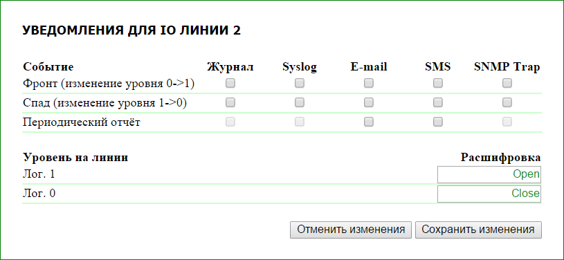 При нажатии на кнопку «Настроить» появляется меню настроек для отправки уведомлений следующих видов: Журнал, Syslog, E-mail, SMS (в устройствах со встроенным GSM модемом) и SNMP Trap, а также расшифровка цифровых значений текущего уровня IO линии: