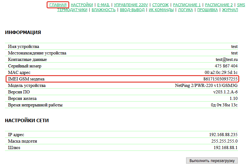 Для получения IMEI (международный идентификатор мобильного оборудования) встроенного GSM-модема необходимо перейти на главную страницу web-интерфейса: