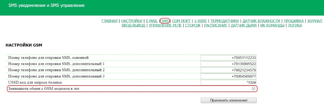 Расширенный лог для GSM модема включается на странице «SMS» web-интерфейса устройства: