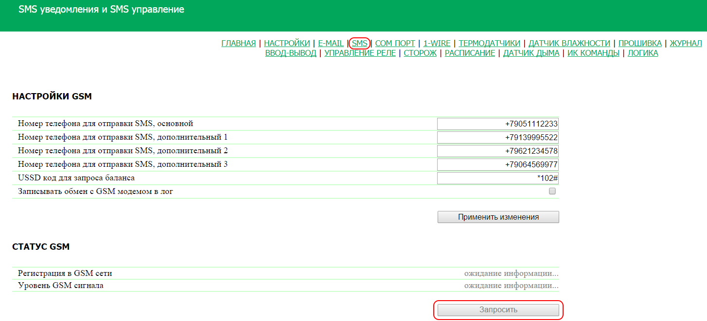 В разделе «Статус GSM» нужно нажать кнопку «Запросить». Через несколько секунд в поле «Регистрация в GSM сети» появится информация о том, в какой сотовой сети зарегистрирована SIM-карта. В поле «Уровень GSM сигнала» появится информация о состоянии сигнала в процентах.