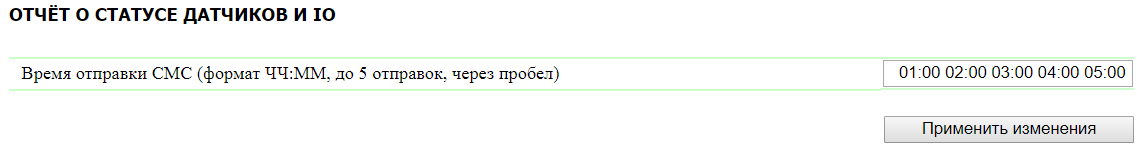Время отправки ежедневной СМС (формат ЧЧ:ММ, до 5 отправок, через пробел) — время, когда будут отправляться отчеты по SMS о состоянии датчиков, IO линий и реле. По умолчанию: пустая строка.