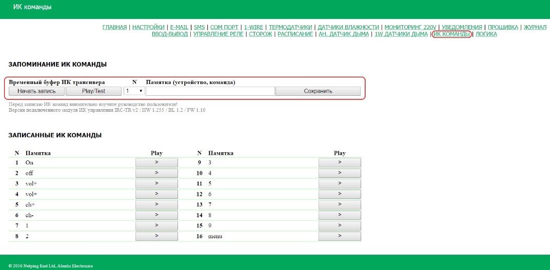 Для записи ИК-команд необходимо перейти на страницу «ИК КОМАНДЫ» web-интерфейса устройства: