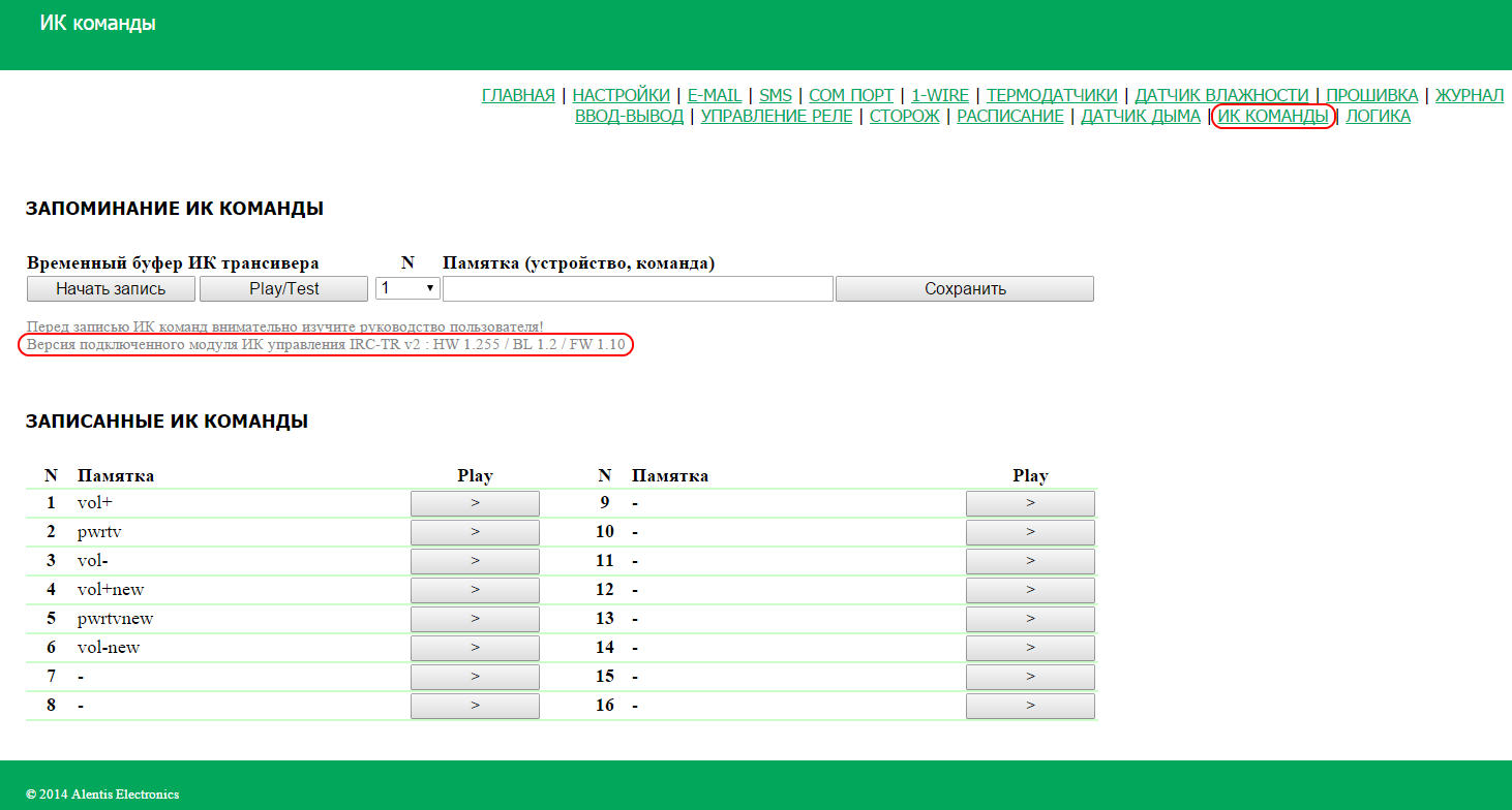 Чтобы определить версию встроенного ПО ИК-модуля расширения, необходимо перейти на страницу «ИК КОМАНДЫ» web-интерфейса устройства: