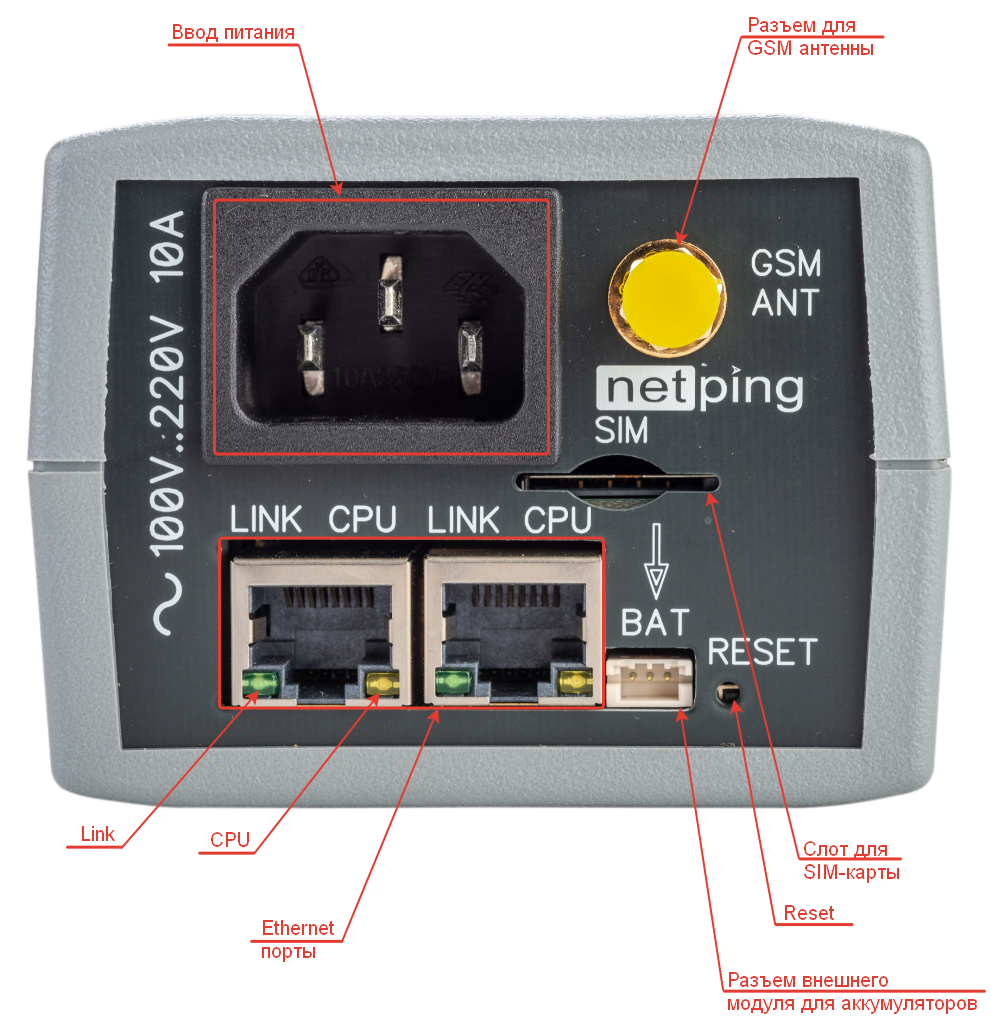Слот для сим-карты | Слот для установки SIM-карты формата Mini-SIM. Присутствует только в модели NetPing 2/PWR-220 v33/GSM3G, со встроенным GSM-модемом |
