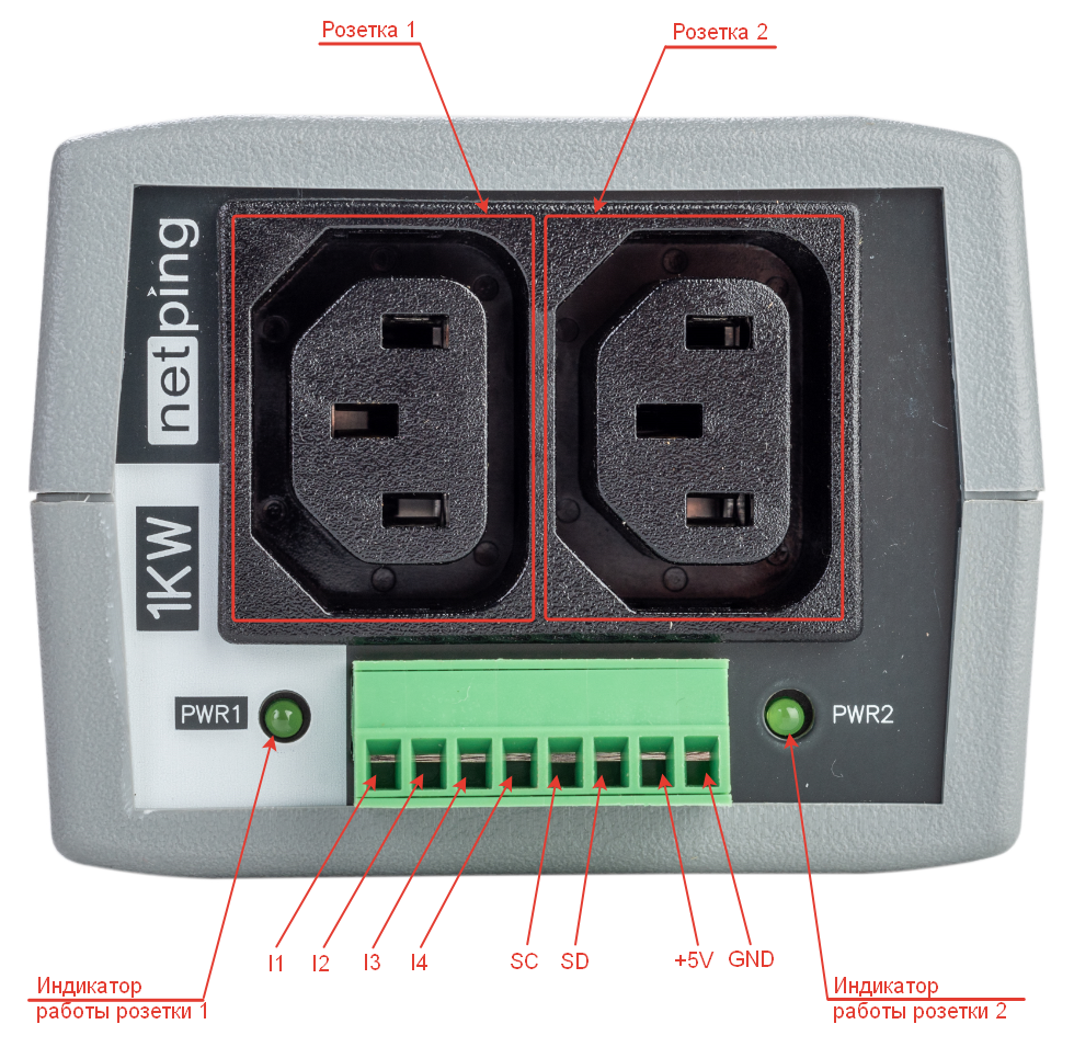 Розетка PWR1 и PWR2 | Выходные розетки для удаленного управления (включение, выключение, перезагрузка) нагрузкой. Коммутируемая мощность нагрузки до 1,5 кВт (суммарно на оба канала с произвольным распределением между каналами). Розетки питаются через нормально замкнутое реле — это означает, что в случае выхода БП прибора из строя (или иной причины, когда прибор не работает при наличии питания на входе) на выходные розетки будет подано питание |