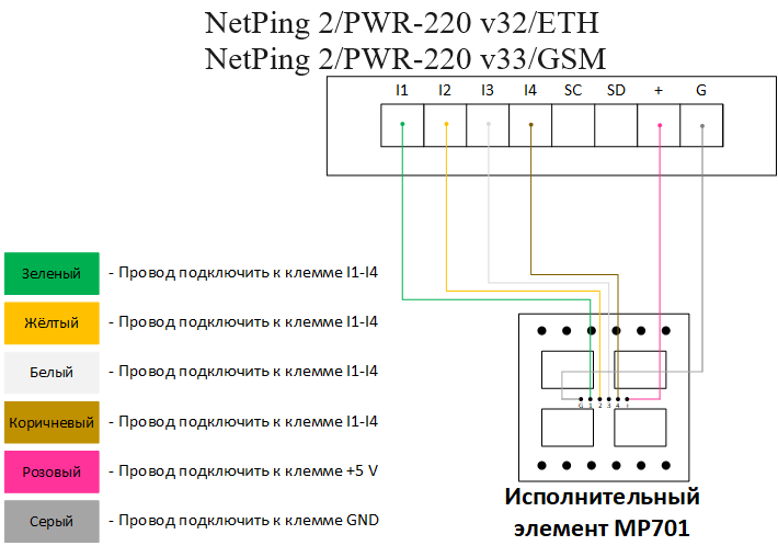 Количество подключаемых MP701 ограничено только количеством свободных линий IO. Таким образом, можно подключить один исполнительный элемент.