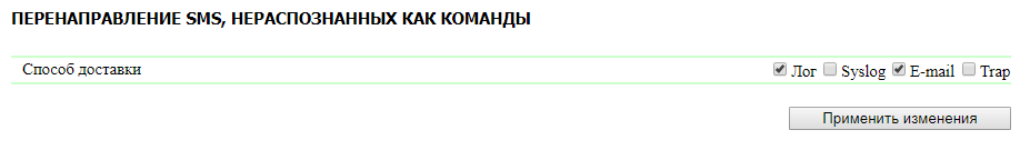 Перенаправление настраивается в соответствующем разделе на странице SMS web-интерфейса устройства (Рис. 10.12.1.). Выбрав чекбоксами необходимые способы доставки, сохраните изменения кнопкой «Применить изменения».