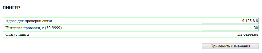 В разделе «Пингер» на странице SMS (Рис. 10.5.2.) можно настроить адрес проверки доступности узла сети в поле «Адрес для проверки связи» и интервал проверки в поле «Интервал проверки, с (30-9999)»: