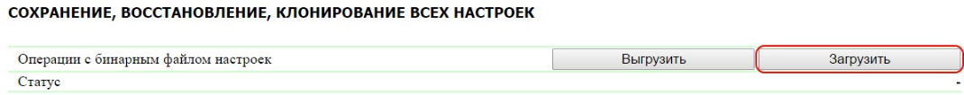 Для загрузки резервной копии настроенной конфигурации из бинарного файла в устройство необходимо зайти на страницу «НАСТРОЙКИ» веб-интерфейса устройства. В разделе «Сохранение, восстановление, клонирование всех настроек» нажать кнопку «Загрузить» (Рис. 3.12.2.):