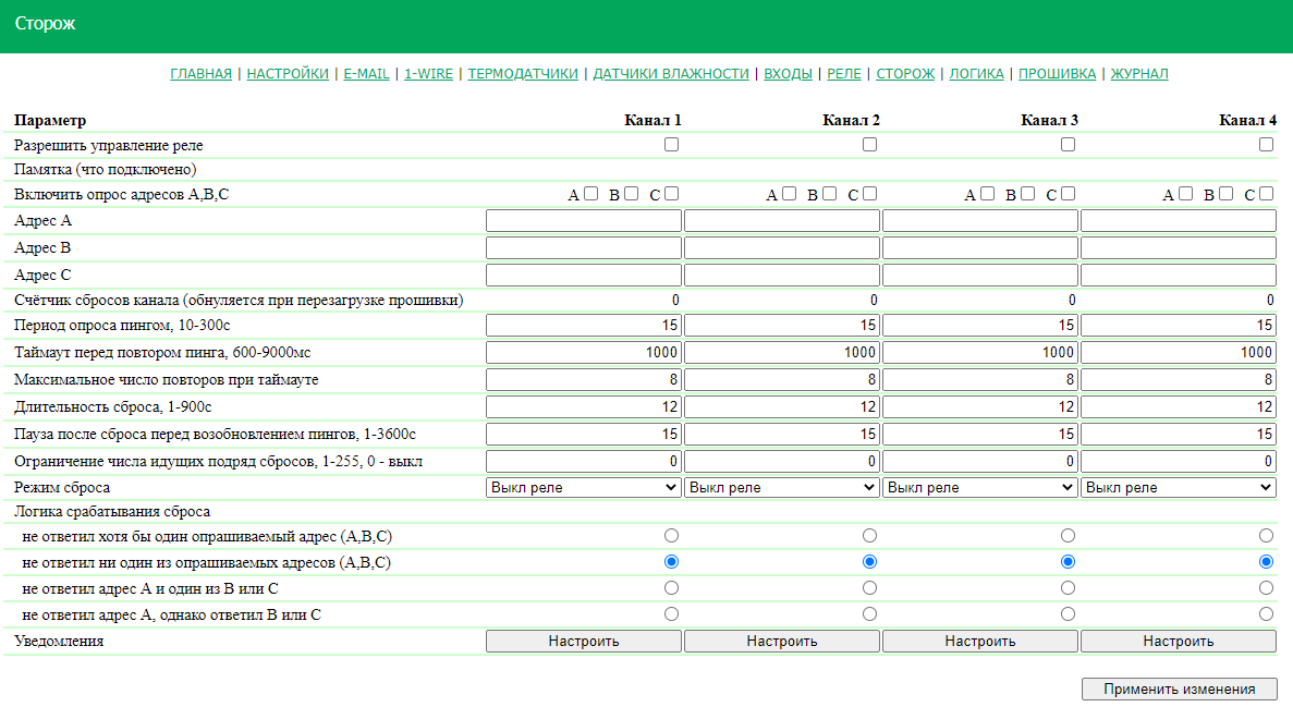 Разрешить управление реле — флажок, который разрешает модулю «Сторож» управлять реле. Каждый канал сторожа управляет соответствующим реле. По умолчанию: чек-бокс не установлен.