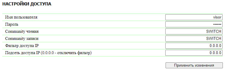 Имя пользователя — имя пользователя для доступа к веб-интерфейсу устройства. Допустимы буквы латинского алфавита, буквы кириллического алфавита, цифры и некоторые спец. символы. Максимальный размер — 16 символов. По умолчанию: visor.