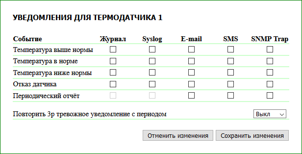 Повторить 3р тревожные уведомления с периодом — опция трехкратного повтора тревожного уведомления с заданным интервалом (5, 30 минут, 2, 6, 12, 24 часа). Если показания вошли в норму, повторы прекращаются. Повторное уведомление содержит время первоначального события (например, 23:21:15.719 Термо: кан.1 +26C, выше нормы (10..20C) c 01.06 23:16).