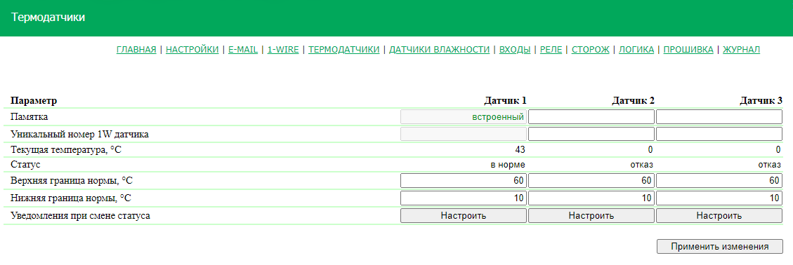 Для взаимодействия с датчиком через веб-интерфейс, нужно перейти на страницу «ТЕРМОДАТЧИКИ».