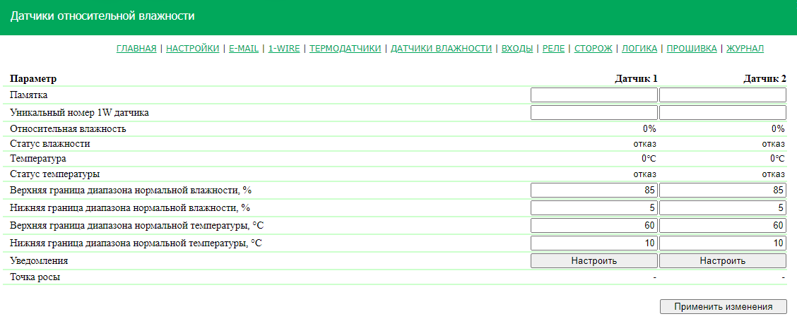 Для взаимодействия с датчиком через веб-интерфейс, нужно перейти на страницу «ДАТЧИКИ ВЛАЖНОСТИ».