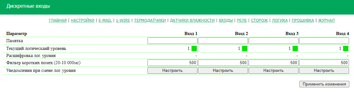 Настроить входы можно на странице «ВХОДЫ» веб-интерфейса устройства.