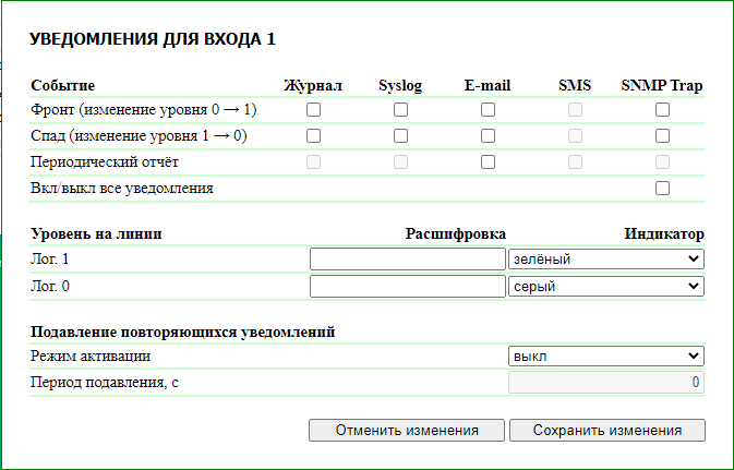 Спад (изменение уровня 1->0) — включение отправки уведомлений при смене статуса входа с «1» на «0». По умолчанию: флажок не установлен.