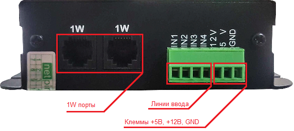 1W порты | Порты для подключения 1-wire-датчиков. Каждый порт 1-wire имеет свой выходной каскад и не зависит от длины проводов подключенных к другому порту 1-wire |