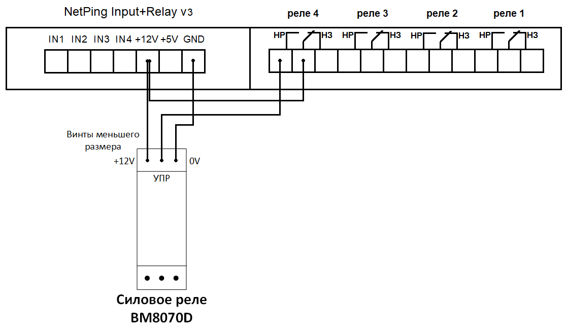 | Кабельная перемычка между COM (средний контакт используемого реле) и +12V контроллера |