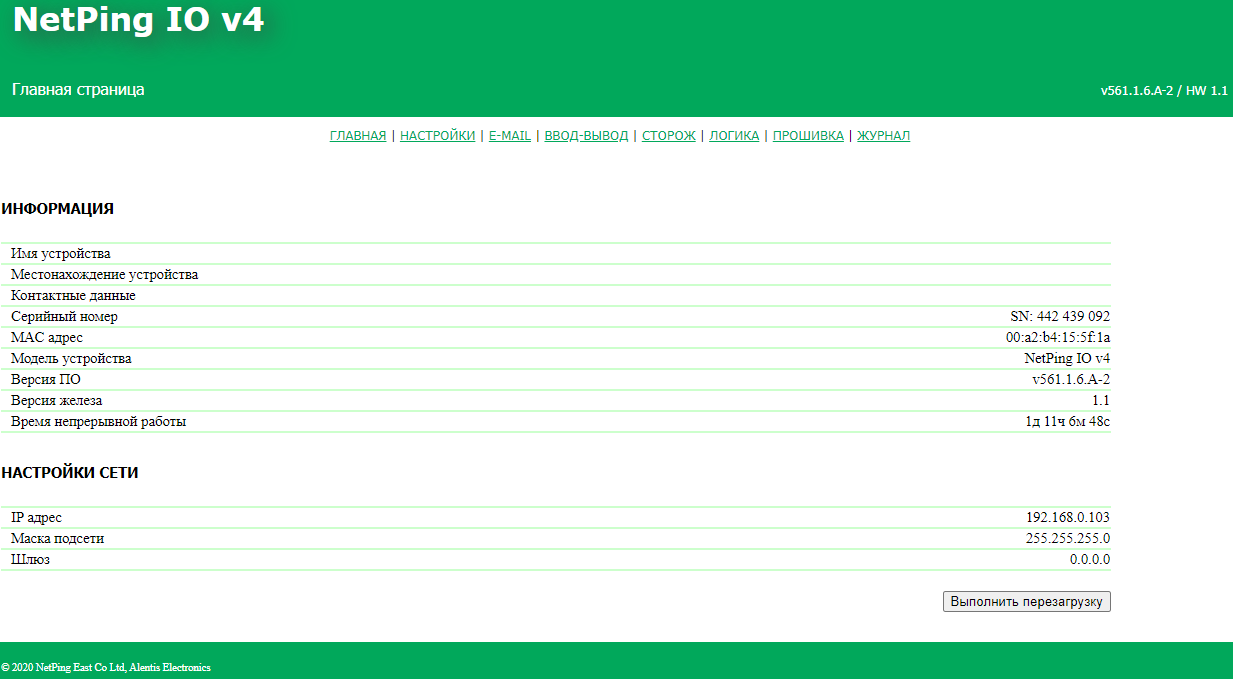 Имя устройства — позволяет различать несколько однотипных устройств NetPing по имени. Имя отображается на главной странице, в заголовке веб-интерфейса и включено в уведомления. Может быть изменено на странице «НАСТРОЙКИ», доступно по SNMP.