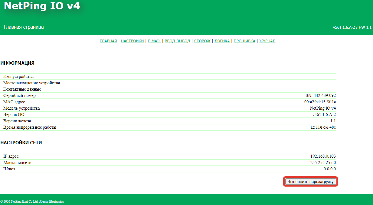 На главной странице устройства, в нижней части интерфейса кнопка «Выполнить перезагрузку»: