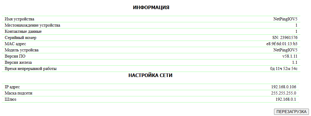 На главной странице устройства, в нижней части интерфейса нажать на кнопку «Выполнить перезагрузку».